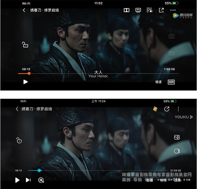 上圖為騰訊視頻手機端APP的HDR致彩視界模式,下圖為優酷手機端APP的幀享影