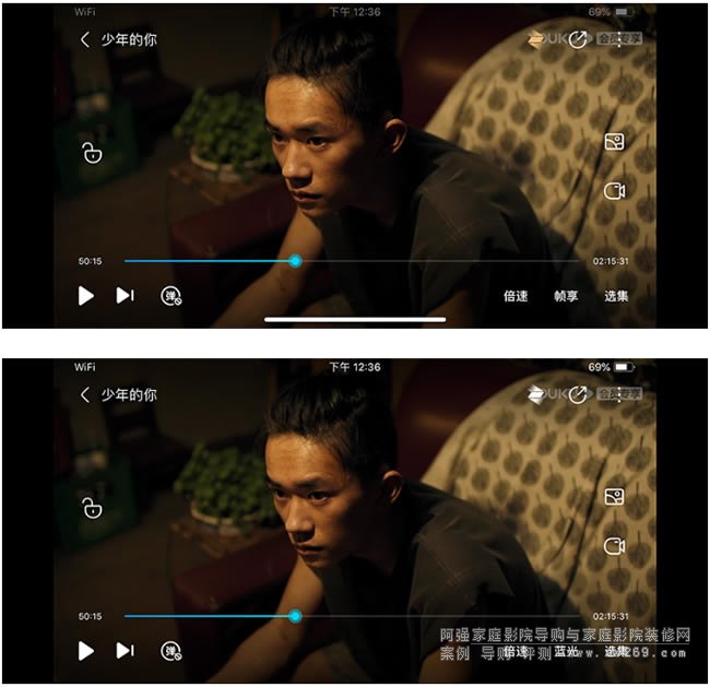上圖為優酷手機端APP的幀享影音模式,下圖為普通藍光模式(使用的手機是