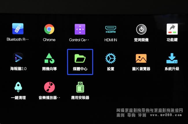▲ UHD2000的基本開機畫面,由左至右分別是:資料夾、海報墻、音樂播放、應用程式和設定。