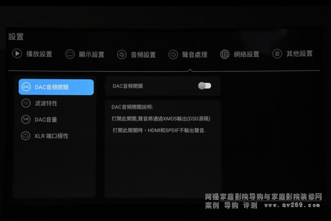 ▲ 而在「聲音處理」選單中,如果將DAC音頻開關設定為「開」,聲音將通過XMOS輸出,就能支援Native DSD檔案播放。在這樣的狀態下,HDMI和SPDIF不輸出聲音,只由XLR和RCA類比端子輸出聲音。而在同頁面下還能選擇多種濾波模式,甚至是改變XLR的端子極性,功能非常完整。