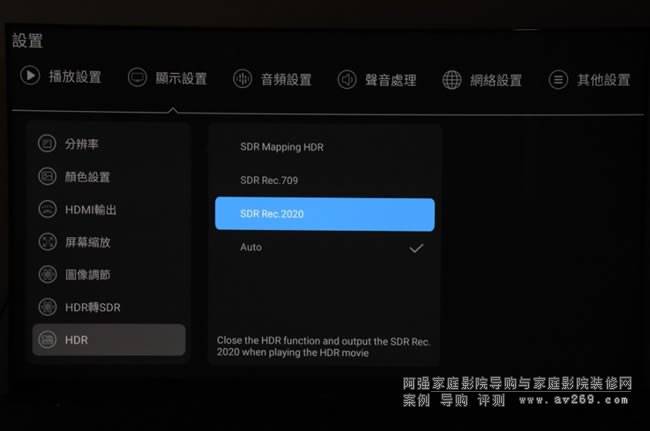 而內行的玩家就知道,當HDR轉成SDR時,也會連帶犧牲了HDR影片原本帶的Rec.2020色域,而UHD2000很靈活,它還能再設定是轉成Rec.2020或是Rec. 709色域。也就是說,如果你選擇Rec.2020,當HDR轉成SDR時并不會犧牲原有的色域,即使是不支援HDR的早期設備也能夠還原近似HDR影片的廣色域,這項功能是以前沒有人做的,而UHD2000細膩的提供了。另外,如果你是使用支援HDR的顯示器材要播放SDR影片,UHD2000也支援「將SDR影像擴張成HDR輸出」。