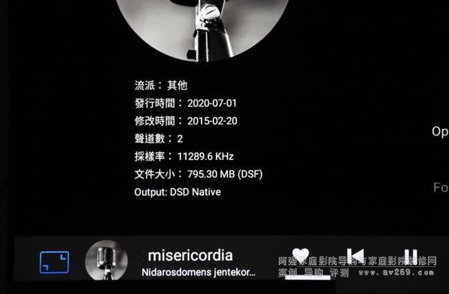 ▲ 當進行檔案播放時,畫面上的資訊非常豐富,不僅有專輯封面圖,還會詳細列出流派(類型)、發行時間、唱片公司、專輯、聲道數、取樣率、比特率、文件大小和文件格式(例如是WAV或DSF),如果是播放DSD檔案,還會直接標示Output:DSD Native,如果你的硬碟中收藏很多高解析檔案,一定會喜歡這樣清楚明瞭的資訊。
