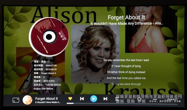 如果是播放歌曲檔案,畫面上會呈現完整的取樣率、格式等資料,如果成功播放原生DSD檔案,則會標示Output:DSD Native。如果對歌曲內容有興趣,還可以在播放期間即時透過網路自動找歌詞。而且UHD2000有專屬的App,可以讓你在不開電視的狀態下直接看著手機App播放音樂。