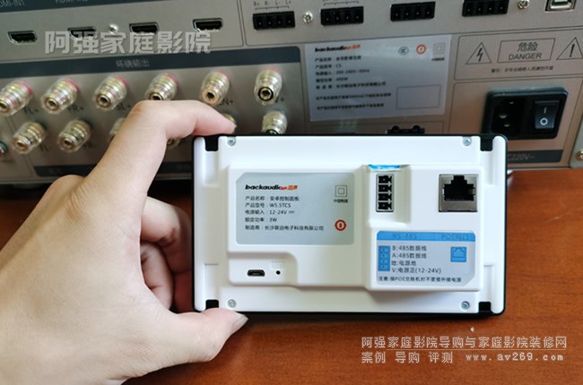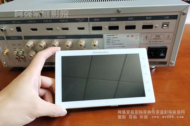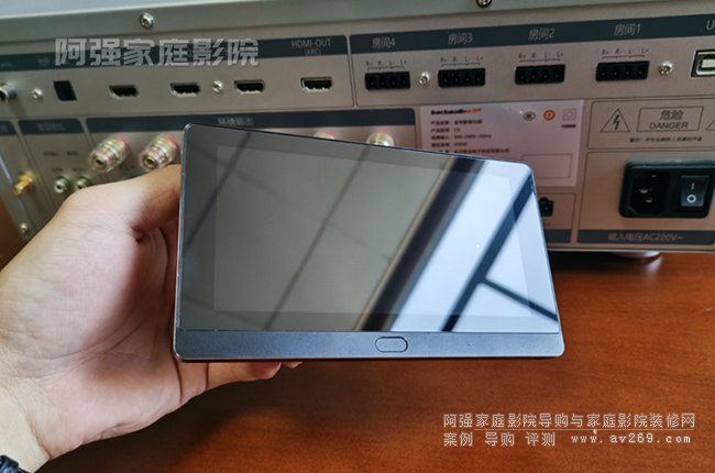 康橋C5的7英寸多媒體中心,裝在主分區(5.1影院分區),康橋的各種設置、切換模式都可以通過它來完成,外形酷似泊聲海豚300S背景音樂一體機,做工精湛。由于不帶功放,所以整機輕薄很多,入墻安裝更方便。1024×600分辨率的IPS屏幕顯示效果十分亮眼,2.5D高壓應力鋼化玻璃使得手感和顏值都可得高分。