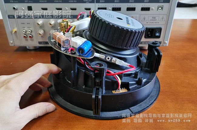 康橋C5的這套揚聲器里配置了一只8英寸超低音音箱,后置倒相孔設計,采用18mm厚的MDF環保板材,工藝考究,分量十足。它的最大功率可達200W,頻響范圍為40Hz~250Hz,實力級參數了。