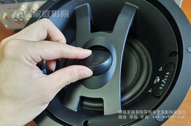 泊聲專門定制的一款斜面吸頂揚聲器,功率60W,拿在手上能感覺它分量十足。不同于一般的吸頂揚聲器,它的發聲單元均采用斜角設計,可以更好的將聲音定向到聽音觀影位置:它的中低音單元與水平面呈15°傾角,高頻頭則可以30度手動調節轉向,讓聲音指向性更強。而且兩個發聲單元均支持頻響調節。