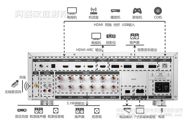 可以看到,康橋C5的背面接口非常豐富。左上角是同軸、光纖以及4個HDMI接口,其中一個支持ARC回傳,可以用來連接電視或是投影儀等設備。旁邊是四個分區的背景音樂左右聲道揚聲器接口。