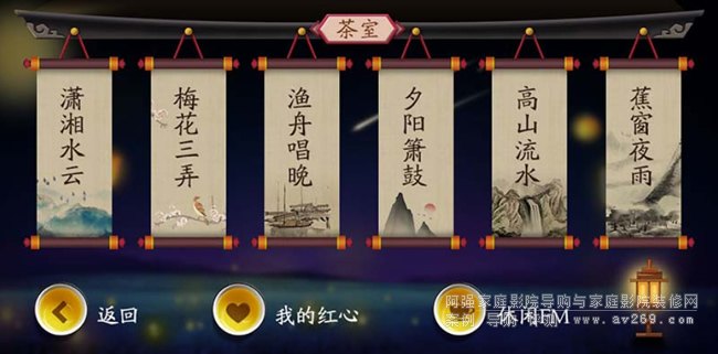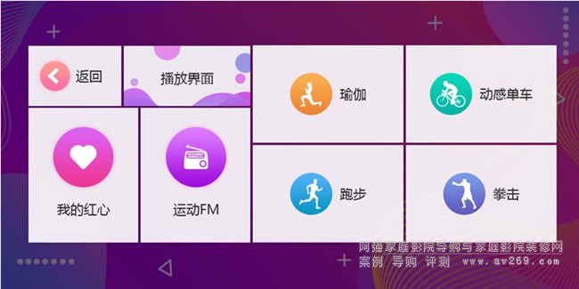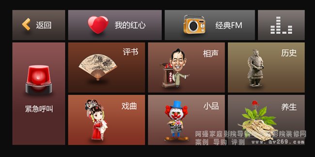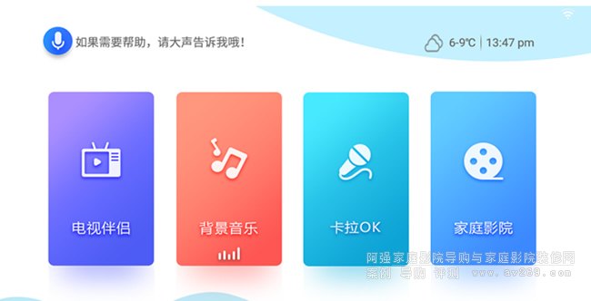 系統內置“我的影院”、“云視聽極光”兩種應用。“我的影院”就是將智能電視、機頂盒或其他外接播放機作為信號源,如果是連接電視機就將其連接到HDMI-ARC接口,如果是外接機頂盒或其他專業播放設備,則將其接入其它3個HDMI接口中,并將信號源設為對應的HDMI接口。測試接的是一臺威動V8播放機。