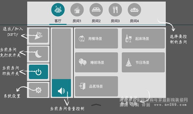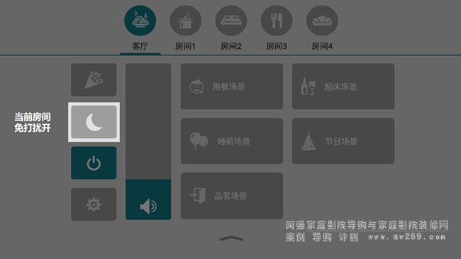 點擊“一鍵party”,全宅的揚聲器就會同步播放,聚會或是慶祝的時候會比較有用,這個也是泊聲中央機原有的功能,到了康橋C5這里則再次進行了一些細節上的改良,比如房間可以自行設置免打擾,可以拒絕參與到全宅的同步播放了,這樣每個房間的自主權更受到尊重。