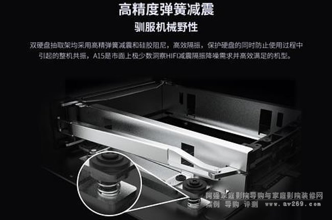 A15雙硬盤抽取架均采用了德國工藝彈簧減震,旁邊的散熱風(fēng)扇及電源變壓器也采用定制硅膠減震,確保機器物理震動減小,可防止音畫質(zhì)的劣化。同時各區(qū)域均以厚實的金屬罩屏蔽隔離,防止相互之間的電磁干擾。不僅如此,還可另外選配金屬避震腳釘?shù)扰浼,進一步減少震動,細節(jié)極其用心。