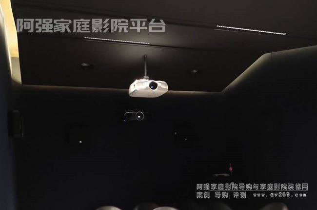 影音室觀影位置全景,全屋深色,只通過燈光進行造型渲染,保證關燈后色彩忠實的還原!這是獨立影音室最佳環境光保證,現實家庭影音室中很難達到,因為要考慮到主人的各類喜好,不想把自己的影音體驗空間做成小黑屋,但用深色不反光材質面料是永恒不光的。更多影音室案例參考請關注阿強家庭影院網!