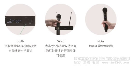 2、接下來是無線接收機操作,長按SCAN旋鈕6s,接收機會自動搜索空閑頻點,隨后再點擊sync按鈕,就進入了匹配狀態。