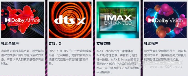 杜比全景聲(Dolby Atmos®)、DTS:X®、DTS Virtual:X™ 和 IMAX® 增強處理均受支持,可讓您收聽所有喜愛的音頻格式,最高可達 19 聲道 (15.4)。