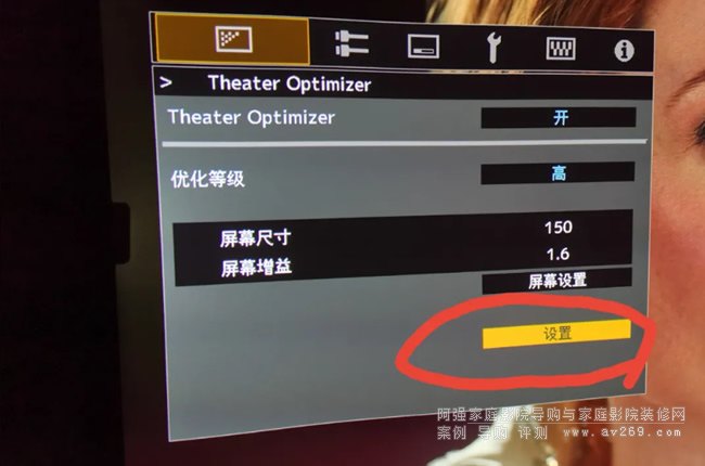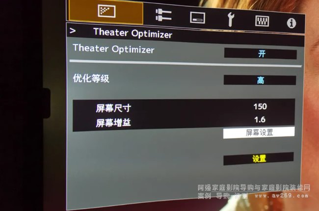 7、屏幕參數輸入完成以后,實際上投影機并沒有應用這些參數,一定要點擊“TheaterOptimizer”子菜單最下方的”設置”按鍵,這時輸入的參數才會應用,屏幕上會出現“處理中”字樣。等待投影機芯片處理完畢,以上參數才會起作用,并被應用到每幀畫面的畫質優化計算。