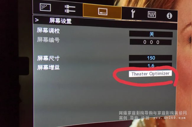 6、輸入屏幕參數:按“屏幕設置按鈕”,設置屏幕尺寸、屏幕增益。這兩個參數輸入完成后,不要按遙控器上的“back”返回鍵(會進入屏幕設置目錄),點擊下方的“Theater Optimizer”按鍵,回到“影院優化師”子菜單。