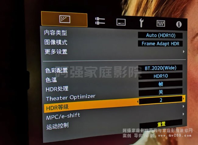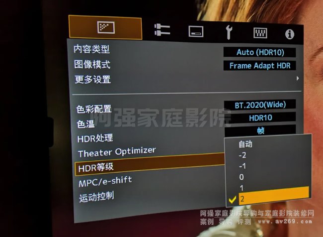 關掉“Theater Optimizer”以后,可以手動設置“HDR等級”,一共有5檔設置,或者“自動”。如果設置為+1或者+2后,畫面亮度也很不錯。用“影院優化師功能”?還是手動設置較高的HDR等級(+1、+2)?
