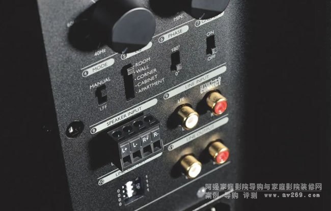 如果用戶家里的功放沒有專門的超低音輸出,那么則可以將前級放大器或者合并機的line out接口與KF92的RCA輸入連接,然后KF92的輸出接口接入后級放大器(合并機則不必)。如果用戶所用的音響系統沒有line out接口,依然可以通過SPEAKER IN喇叭接口,去連接功放喇叭輸出的四條線。這是在雙聲道Hi-Fi系統中加入超低音的常用方式,但市面上能同時支持這些安裝方式的超低音則很少,要像KEF這樣的老牌廠商才會設計得如此周到。