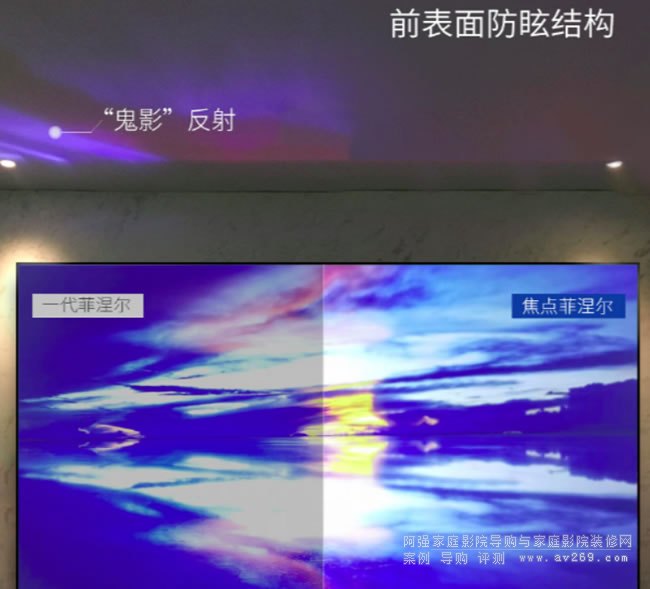 菲涅爾結(jié)構(gòu)的表面是光滑的,外觀看起來很像液晶屏,但是卻會帶來一個很大的問題,就是“鏡面反射”,在房間頂部反射形成一個小畫面,俗稱”鬼影”,非常影響觀看體驗,焦點菲涅爾屏幕采用前表面防眩光結(jié)構(gòu)處理,大大緩解了頂部反光現(xiàn)象,讓觀看更具舒適感。