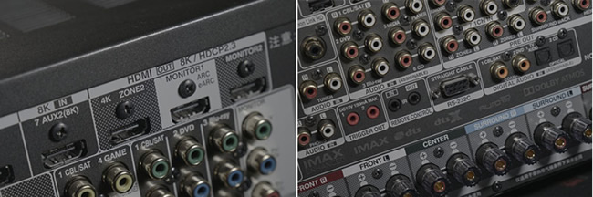 AVC-A110 AV功放的HDMI I/O部分提供8進3出配置。其中,1~6進支持4K UHD,僅HDMI 7輸入是支持8K UHD。背部就很清晰地標明功放所支持的三維沉浸式音效格式