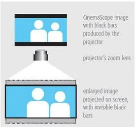 第三種方法就是利用投影機的變焦,把上下黑邊擠出幕布范圍。優(yōu)勢是不增加成本,簡單方便,缺點是損失了芯片的一部分分辨率,并且損失了亮度。