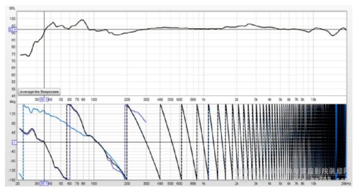 但是它有一個問題,就是下盤的頻率延伸弱了些,實測低音炮的頻率下限基本在30Hz以上,音箱在180Hz以上(沒有裝入吊頂,沒有障板墻的情況下測得數據),經過調試它們可以完美融合。