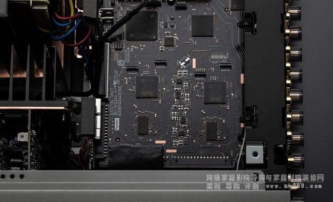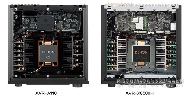▲比較AVR-A110與AVR-X8500H內(nèi)部,我們可以看到AVR-A110就像是AVR-X8500H的「黑色版本」,然而兩者之間的差別不是只有顏色這么簡單,在此就可以看到在后部上方的數(shù)位主板變化頗大:左側(cè)的數(shù)位影像電路AVR-A110加入了能相容8K的HDMI2.1介面(介面晶片上面有散熱片),中央的HEOS模組AVR-A110的藍(lán)牙進(jìn)化為4.2版本、頂部加上阻擋電磁波向外釋放的金屬屏蔽蓋板。