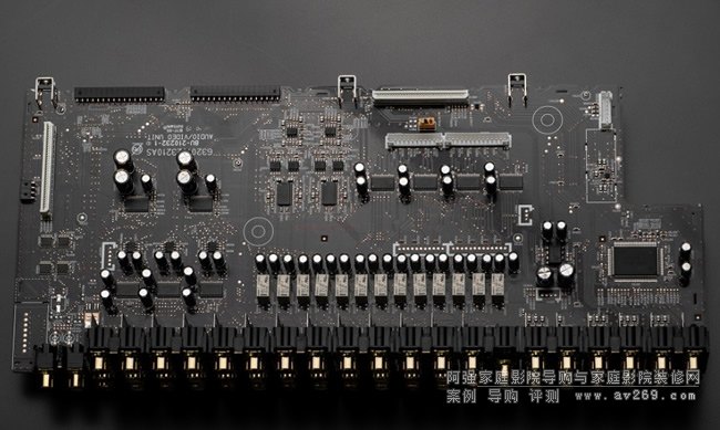 在功率放大電路部分,AVR-A110比照AVR-X8500H「一個聲道用一塊電路板」的單聲道化設(shè)計,在變壓器的左側(cè)有7聲道、右側(cè)裝6聲道,總計內(nèi)建13聲道功放電路。在X8500H的前半部,功放電路與變壓器的下方都是鎖在一個凸起的金屬底盤結(jié)構(gòu)上,而AVR-A110還在變壓器與底盤之間加墊了一塊銅板、進(jìn)一步抑制振動。