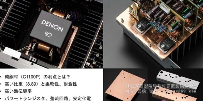 ▲Denon在日本的簡報中說明了A110使用純銅材料(C1100P)主要是因為它的比重高可以抑制振動、有柔軟性讓接觸的材料能鎖得更貼合、還有良好的導(dǎo)熱特性,因此Denon把純銅材料用在電源變壓器與底板的接觸部分(制振),用在功率晶體、橋式整流、穩(wěn)壓電路與散熱器之間的接觸部分加強(qiáng)導(dǎo)熱。