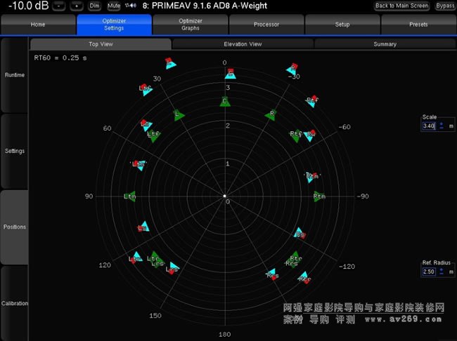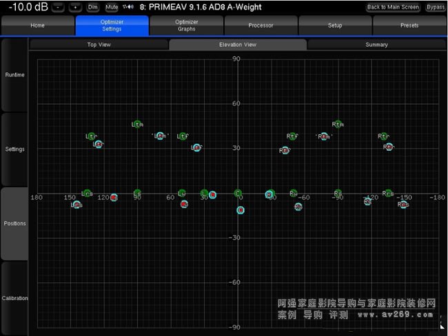 ▲這是各聲道喇叭在空間中的俯視圖,淡藍色標志是Altitude16實際測到的喇叭裝設(shè)狀況,綠色標志則是各聲道喇叭的「理想位置」,既然Altitude16已經(jīng)知道「實際」與「理想」之間的差距,它就能以O(shè)ptimizer與Remapping處理作校正,即使喇叭擺位不能完全合于標準,本機依然能將系統(tǒng)校正到就像把所有喇叭都裝在「最理想位置」的程度。