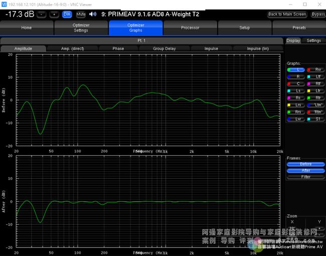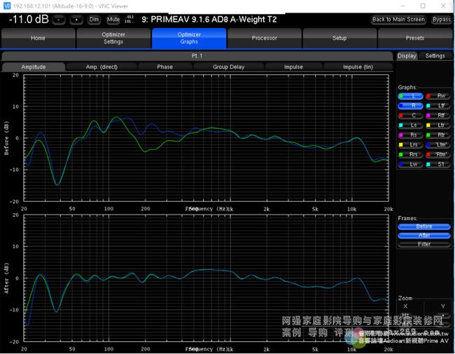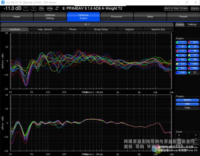 ▲選用Altitude16玩家正常來說都會使用相當高級的喇叭,當然這些玩家對于「好聲」也會有自己的看法,倘若玩家是比較感性的、與「精準」相比他還是比較喜歡自家原來左右聲道喇叭聲音的原始風貌,Altitude16不僅可以尊重玩家的看法、還且還能幫上大忙:本圖上方的綠色與藍色曲線是左右聲道喇叭在聆聽位置上測得的頻響曲線,由于空間左右兩方的反射條件略有差異,所以左右兩邊的響應(yīng)略有差異;下方則是本機把Optimize設(shè)定在「According to L&R speakers」校正之后的狀態(tài),在中、高頻段取左右聲道的平均值,低頻段則消除駐波的影響,它保留了左右聲道喇叭原本的音色,又讓兩方的頻率響應(yīng)趨于一致,它根據(jù)這條左右聲道共用的響應(yīng)曲線,自動調(diào)整其他聲道的等化,這樣就能讓所有聲道喇叭的頻響「學習」左右聲道喇叭。