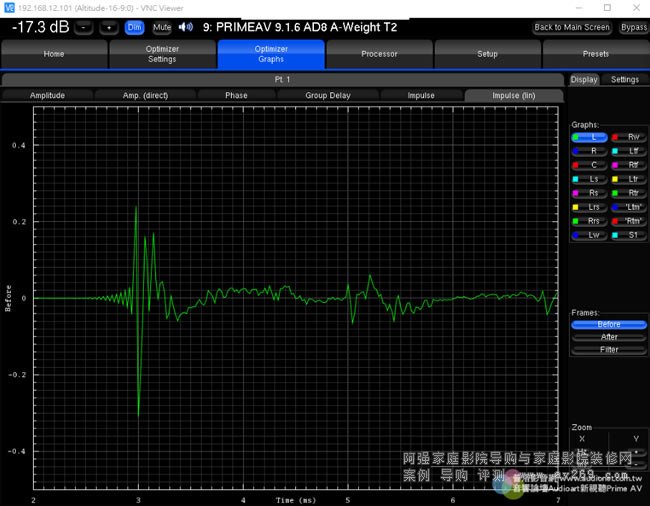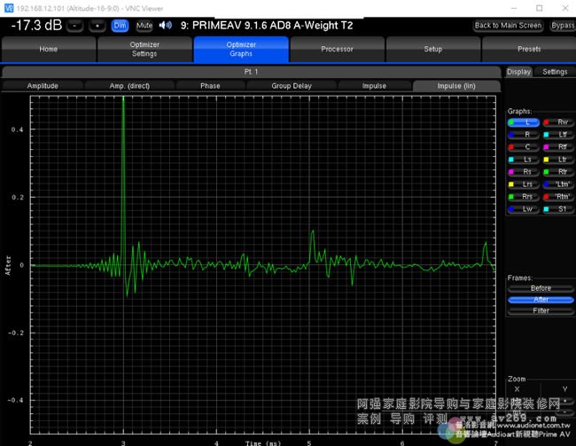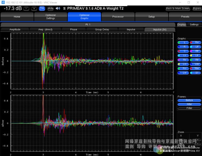 在Altitude16取得三度空間響應(yīng)的精密測試數(shù)據(jù)之后,接下來就要作優(yōu)化,這也正是Trinnov技術(shù)的精華所在。Trinnov Optimizer不只能作精細的頻率響應(yīng)校正、距離(延遲時間)校正、各聲道喇叭與各音路相位一致性的修正,還能改善脈衝響應(yīng)、使全系統(tǒng)能確實表現(xiàn)出優(yōu)異的暫態(tài)特性,還能使初期反射音獲得控制、Room Mode的影響大幅降低。所有聲道喇叭實測的響應(yīng)狀況(before)與優(yōu)化后的結(jié)果(after)全部都明確地以圖表顯示,從頻率響應(yīng)曲線觀察,就能看出響應(yīng)變得非常平坦,并且各聲道喇叭的頻率響應(yīng)曲線也趨于一致。