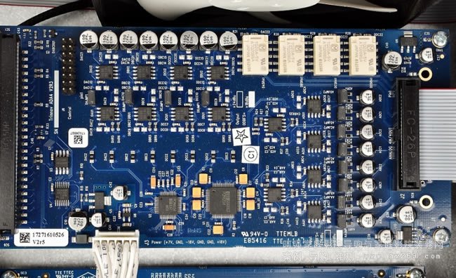 ▲機內(nèi)左側(cè)有三塊電路板迭放:其中上面的兩塊電路板包括A/D與D/A電路(見圖),每塊電路板配置一枚4聲道DAC晶片(TI PCM4104,訊噪比118dB),DAC之后則是使用具有低噪音、寬頻響應(yīng)(15MHz)與低失真(0.0005%)特性的JRC NJM4580雙OPA晶片做平衡放大;最下面一塊電路板則以兩枚PCM4104作成8聲道DAC、平衡放大也是用NJM4580。