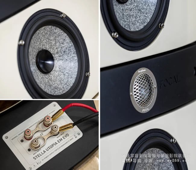Stella Utopia EM EVO延續了FOCAL專利的Focus Time技術,對喇叭單元相位進行優化處理,讓音箱上的所有單元聚焦更為精確。Stella Utopia EM EVO保留了Utopia III的箱體架構,以便降低諧波失真,為了提升聲音的精度與細膩程度,工程師們對分頻電路進行了謹慎細致的重新設計,每一個零部件都經過精心挑選。FOCAL揚名天下的27mm IAL2 純鈹反球頂高音自然是少不了,中音單元是兩只Power Flower 6½" (165mm) 'W' 三明治中音 (帶 TMD 懸架和 NIC 中性電感電路) ,低音單元為一只最新設計的330mm(13寸)'W'復合三明治錐盆低音, 靈敏度94Db, 阻抗8歐,頻率響應22Hz - 40kHz,推薦功率50-1000W。Stella Utopia EM EVO采用三分頻設計,使得箱體更加緊湊適中,分頻點為230 Hz 和2200Hz, 尺寸(H x W x D):1558mm x 553mm x 830mm, 重量170KG。