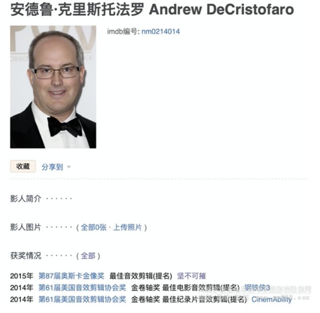 Andrew DeCristofaro(安德魯·克里斯托法羅)是電影《鋼鐵俠3》的聲音剪輯師,并因此獲得了2014年第61屆美國音效剪輯協會獎金卷軸獎最佳電影音效剪輯提名。此外,憑借電影《堅不可摧》和紀錄片《CinemAbility》,Andrew DeCristofaro還先后獲得了2015年第87屆奧斯卡金像獎最佳音效剪輯提名與2014年第61屆美國音效剪輯協會獎金卷軸獎最佳紀錄片音效剪輯提名。
