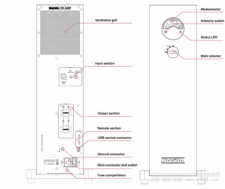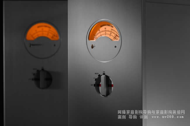 Nagra HD AMP 的前面板裝有傳統的 Nagra Modulometer 表頭,可顯示輸出功率。