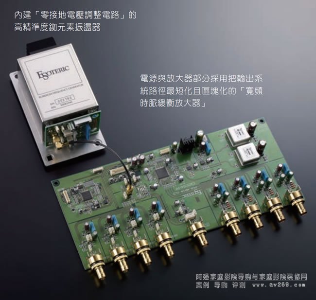 心臟部位內建高精準度的銣元素振盪器采用美國制的高精密度銣元素振盪器(頻率精準度:±0.05ppb=±0.00005ppm),以音質和穩定度為優先,在ESOTERIC專屬的品管下,客制完成了配得上Hi-End機種音質的主時脈產生器。