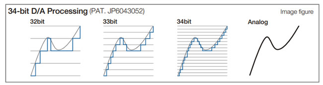 D-05X應(yīng)用了34-bit D/A處理演算法將PCM訊號(hào)轉(zhuǎn)換為類比,此34-bit編碼提供了24-bit編碼的整整1024倍令人震驚的數(shù)位解析度。藉著高位元數(shù)據(jù)將計(jì)算誤差降至最低而實(shí)現(xiàn)了音色細(xì)膩的優(yōu)點(diǎn),即使是最細(xì)微的音樂訊號(hào)都能優(yōu)異的表達(dá)。
