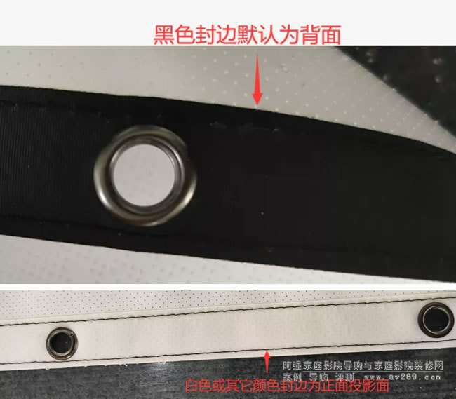 根據幕面邊緣封邊顏色判定:黑色為幕布背面;其他顏色為幕布正面,如下圖