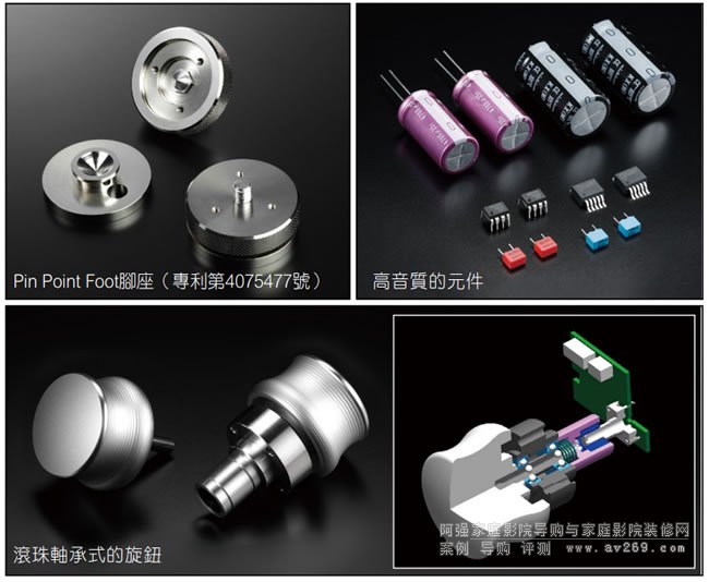 訊號的電平在唱頭放大器放大時會非常的低,所以對于振動非常敏感。因此,機箱結構也經過特別考量,澈底進行抑振。每個零件配置都澈底講究,固定各電路板的機箱底板採用分隔結構,把相互干擾抑制到最小。而且高剛性又厚重的鋁合金機箱還采用ESOTERIC獨家的Pin Point Foot腳座(專利第4075477號),把來自外在的振動影響降到最低。