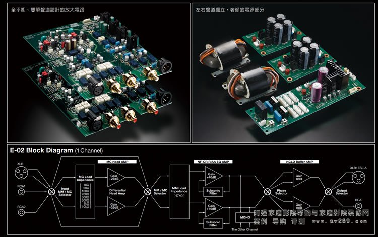 對于唱頭放大器其訊號電平在放大后非常之低的情況而言,抗噪能力強、低阻抗,又能強力傳送、放大訊號的全平衡電路,可說是理想的電路設計。E-02從連接唱臂的輸入端子開始,經由MC放大線路、RIAA等化線路,到最末端的功率放大為止,全部都是採用全平衡架構的設計。所以在使用MC唱頭時,能于全線路完成平衡傳送的純淨放大系統。阿強家庭影院