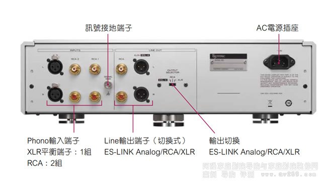 在一般的輸出(XLR、RCA)之外,也支援ESOTERIC獨家的“ESLINK Analog”傳輸方式。活用HCLD電路高速、強大的特性來傳輸電流,這種方式能把支援機種的潛力發揮到極限。