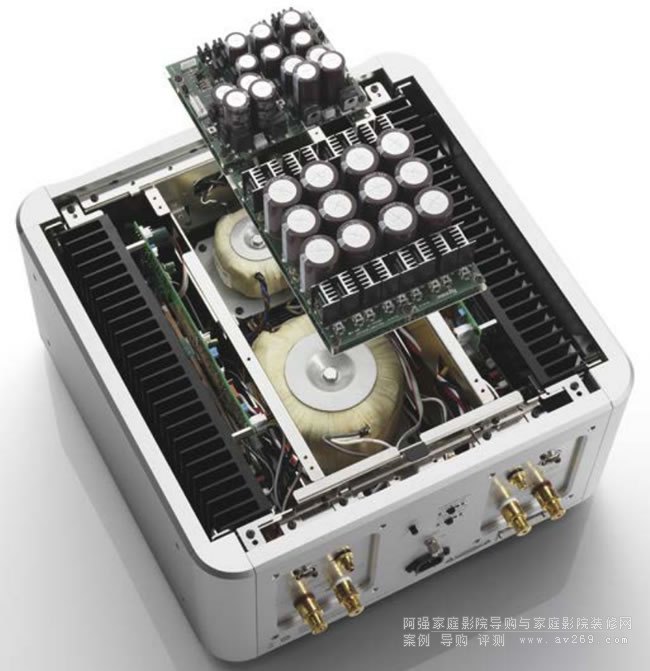 變壓器并無安裝外殼,以防止聲音品質有任何衰減,三排并聯的電容器每聲道共計4,700μF,縮短了充電與放電的次數,供應更緊密快速的聲音,電源供應的接線採用較重的線材,為了將阻抗降到最低,不使用傳統端子,接點采用壓接端子螺栓連接。
