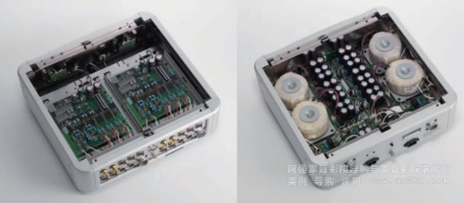 另外,為了達(dá) 到充滿開放 感的聲音,電路板和頂板採用半懸浮設(shè)計(jì),輸入部分和輸出部分的電路板採用表面黏著的方式,幾乎就等同于裝置在箱板之上。而且,電源部分採用複數(shù)層板的箱體結(jié)構(gòu),電路板和變壓器分別固定在不同的箱板上,所以可以避免變壓器產(chǎn)生的振動(dòng)傳到電路板上。另外,用來固定變壓器的底板經(jīng)過精準(zhǔn)