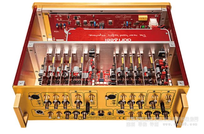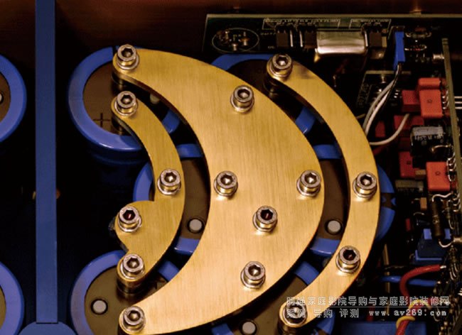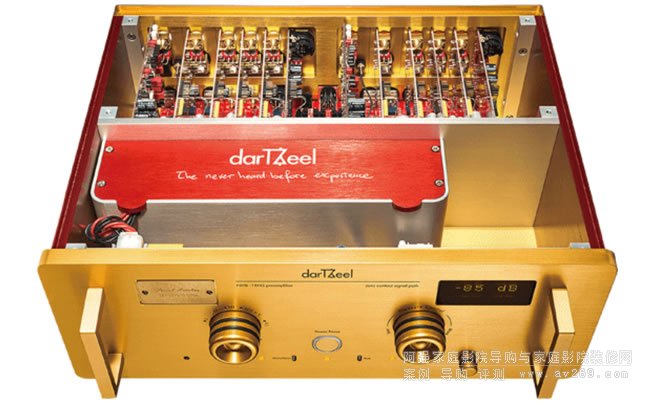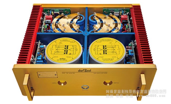 簡單地說,發燒友最好是全套darTZeel產品搭配使用,才能體驗最短放大路徑所帶來的驚奇,同時更穩定,更少匹配上的問題。設計師Hervé Delétraz表示他是用制作樂器的態度,以制作瑞士腕表的工藝和細節來生產達霄功放。例如機箱與面板是以一種ALMg3鋁合金以CNC加工,上面再以特殊方式涂上燃燒紅、電子藍、貴族黃三種顏色,獨特的顏色組合的確能在第一時間吸引眾人目光。制作時每個功放線路板都會經過嚴格的檢測再裝入機箱中,線路板不以銅柱固定在機身上,而是用彈性厚橡膠墊隔開,再以直立式安裝來避震。后級的機箱內以超厚金屬板材隔開成田字型,5mm的底板與強壯的散熱片構成剛性極高的主體且可降低干擾。變壓器分成上下二層,下層是柔性啟動線路,上面才是變壓器,變壓器固定在6mm的厚鋁板上。另外以造型漂亮的超厚鍍金銅板來連接濾波電容,電容以弧形排列,不僅更加緊密節約機內空間也更穩固。