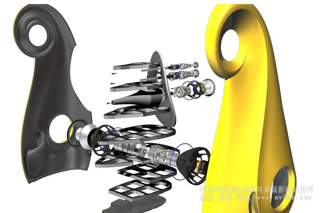 中低音單體 Vivid Audio C125S單體(專利)、短音圈長磁隙電動系統(tǒng)、氣孔式50mm銅質絲帶音圈、密集式單體框架、放射式磁鐵結構、隔離式固定、長錐形導波管