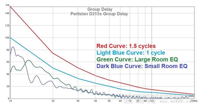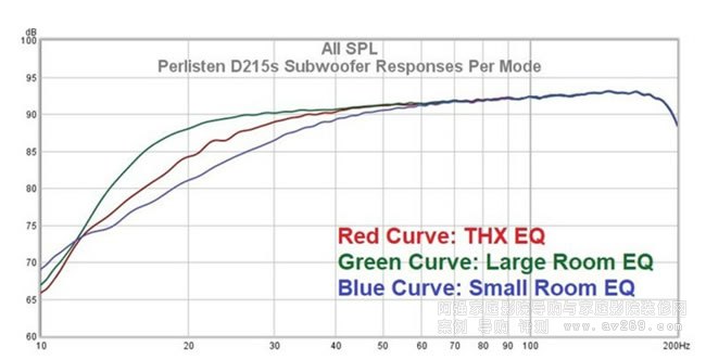 上圖顯示了Perlisten D215s低音炮在每種EQ模式下測量的頻率響應。