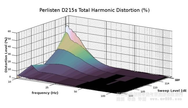 上述圖表顯示了與長期輸出圖表相對應的總諧波失真。從本質上講,它們描述了低音炮在相應驅動電平下的線性程度。測量的數量是低音炮輸出的失真程度,此處以百分比顯示。我們在這里可以看到,D215s可以在低于20Hz的高驅動電平下產生一些明顯的失真量,因此 D215s不能真正維持長時間突發測量中看到的超低失真,但是,它在20Hz以上的失真輸出是我在任何密閉的低音炮上看到的最干凈的,而且幾乎是我測量過的所有低音炮。在100dB和更低的驅動電平下,D215s在任何頻率下都不超過5%的THD。雖然我們已經看到了可以在20Hz以下保持較低失真的低音炮的例子,但D215s提供了非常好的性能水平,并且在次聲低音區域以上的無失真聲音,它的表現幾乎是不可撼動的。