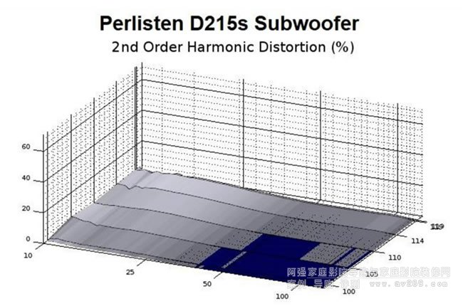 D215s在這項測試中給出了一些驚人的數字,這也符合對其規格參數的預期,該低音炮的完整表現我們將通過測量的失真數據來講述。這是一個密閉低音炮,無論如何努力驅動,20Hz以上都無法出現超過的10%失真,它在20Hz以下也幾乎沒有突破10%。所有這些失真量都遠遠低于任何可聽到的聲音,我們測試過的其他密閉式低音炮都無法以如此低的失真來匹配這種輸出聲壓。除了10Hz的測量,所有的頻率都只受到放大器的限制,而不受失真限制,這意味著低音炮根本無法達到CEA-2010的失真閾值。甚至我們的10Hz測量也受到了背景噪音而不是諧波的限制(由于環境噪音的影響,通過10Hz 測量總是非常困難的,因為相對于本底噪音而言,低音炮在如此深的頻率上的輸出通常不是很高)。