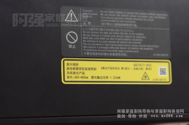 圖4: 作為一款采用激光光源的投影機,在機身上也能夠看到它所采用的激光光源的技術特點,波長為450-460nm的藍光波段,輸出功率小于220nW
