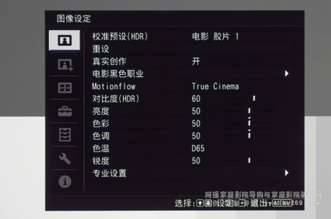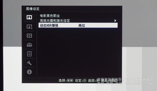 圖1: VPL-VW898能夠自動判別輸入視頻信號的類型,當遇到HDR信號時,圖像設定菜單將會切換成HDR模式,可以看到校準預設模式變成了HDR,對比度也附加了HDR的標識圖